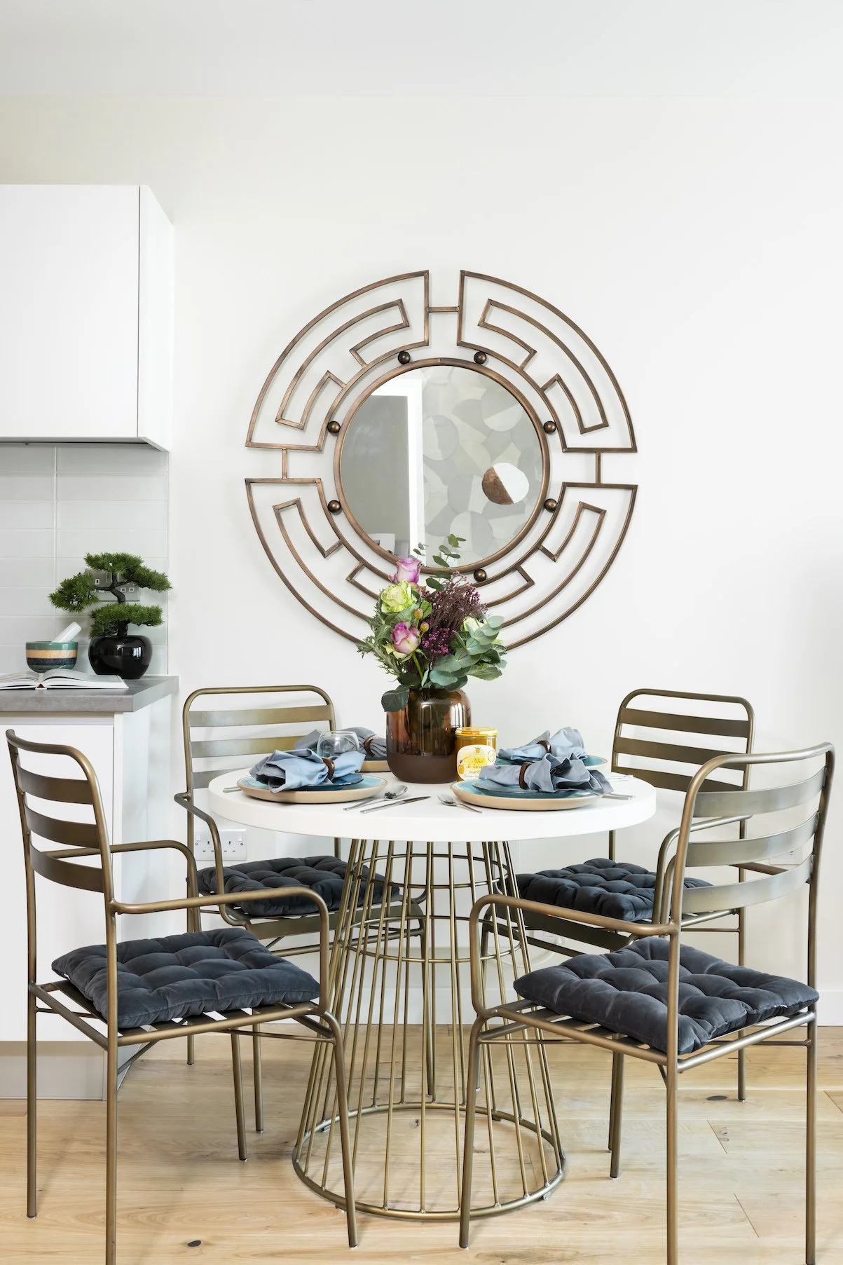 We think this show apartment conveys the perfect combination of glamour meets industrial. The elegant flowing feature pendant in the living area juxtaposes with the dining space and its use of raw metal frames and structures, with everything brought together cohesively by an earthy colour palette.