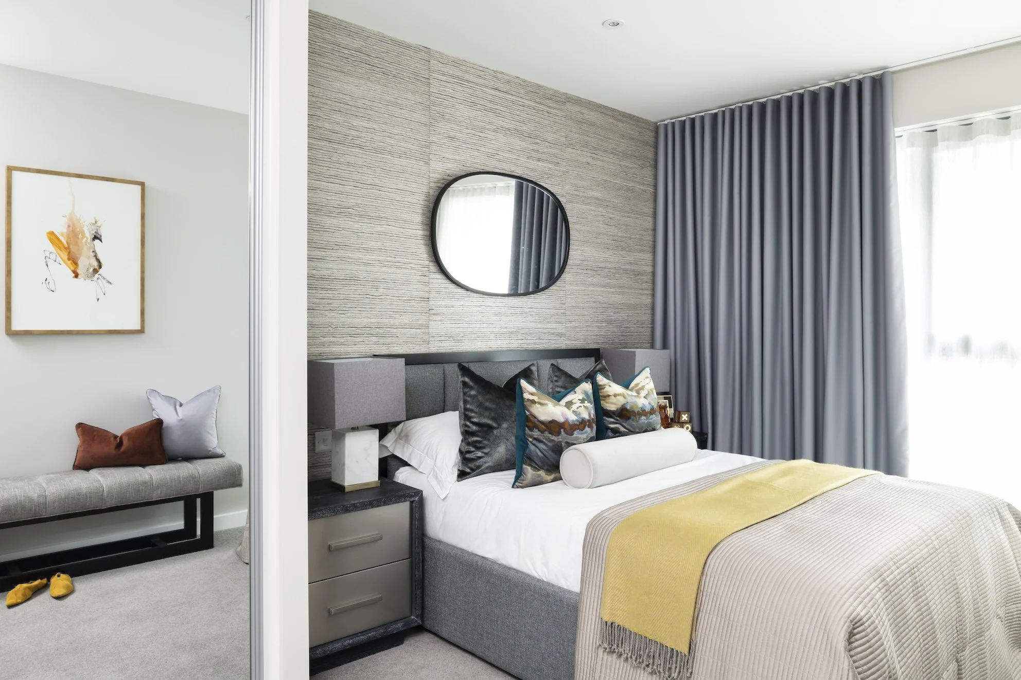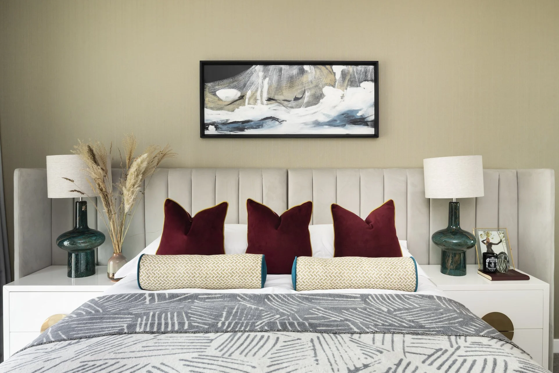 We focused on creating a soft calming vibe in the principle bedroom. A neutral oversized headboard wraps around the bedside cabinets, and the bed was dressed with earthy tones from red velvet cushions to a stone patterned throw. This space truly showcases the character element that was required throughout the apartment.